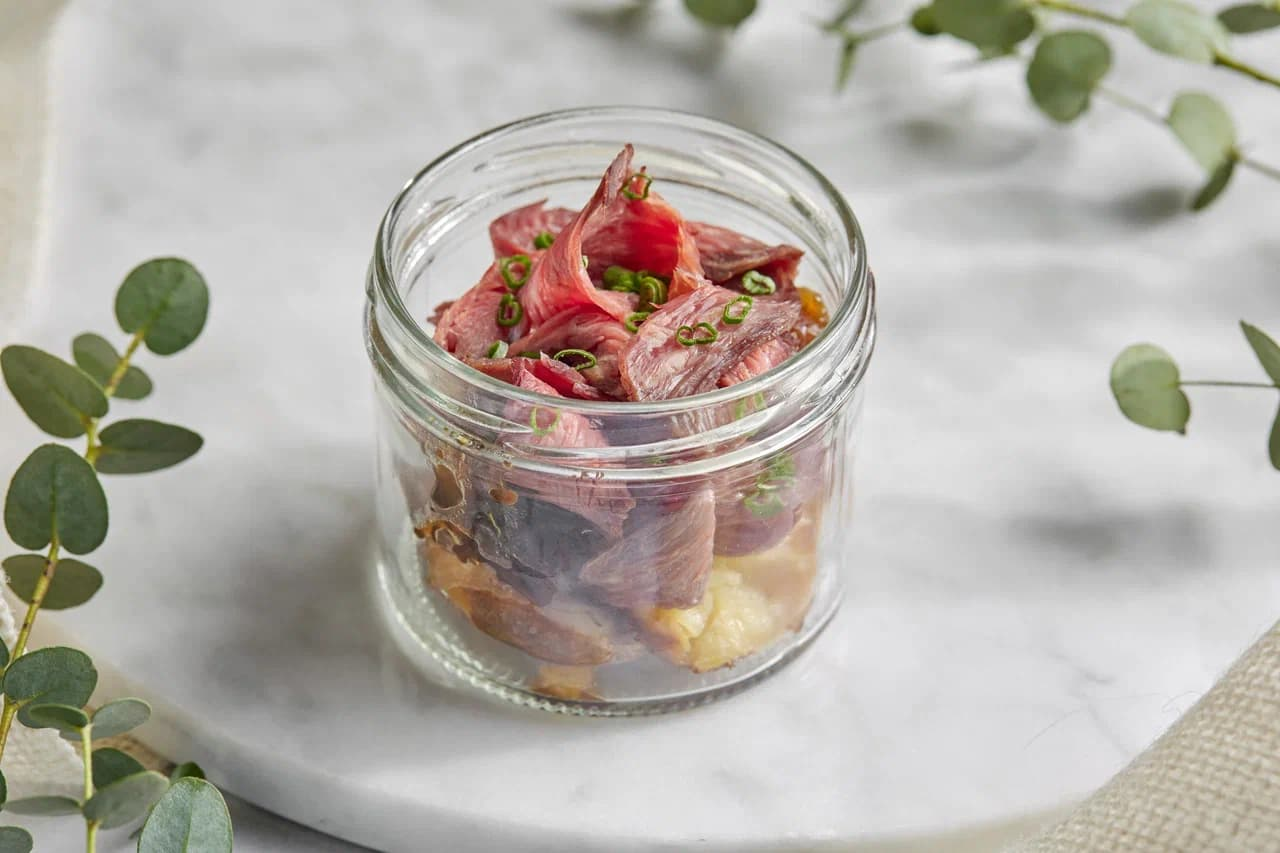 Piyozli murabbo va pishirilgan kartoshka bilan mol go'shtidan pastrami (80 g)