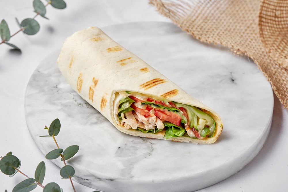 Лепешка, курица, соус BBQ, сливки, масло растительное, романо, огурец, томат, моцарелла.